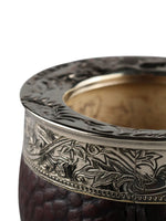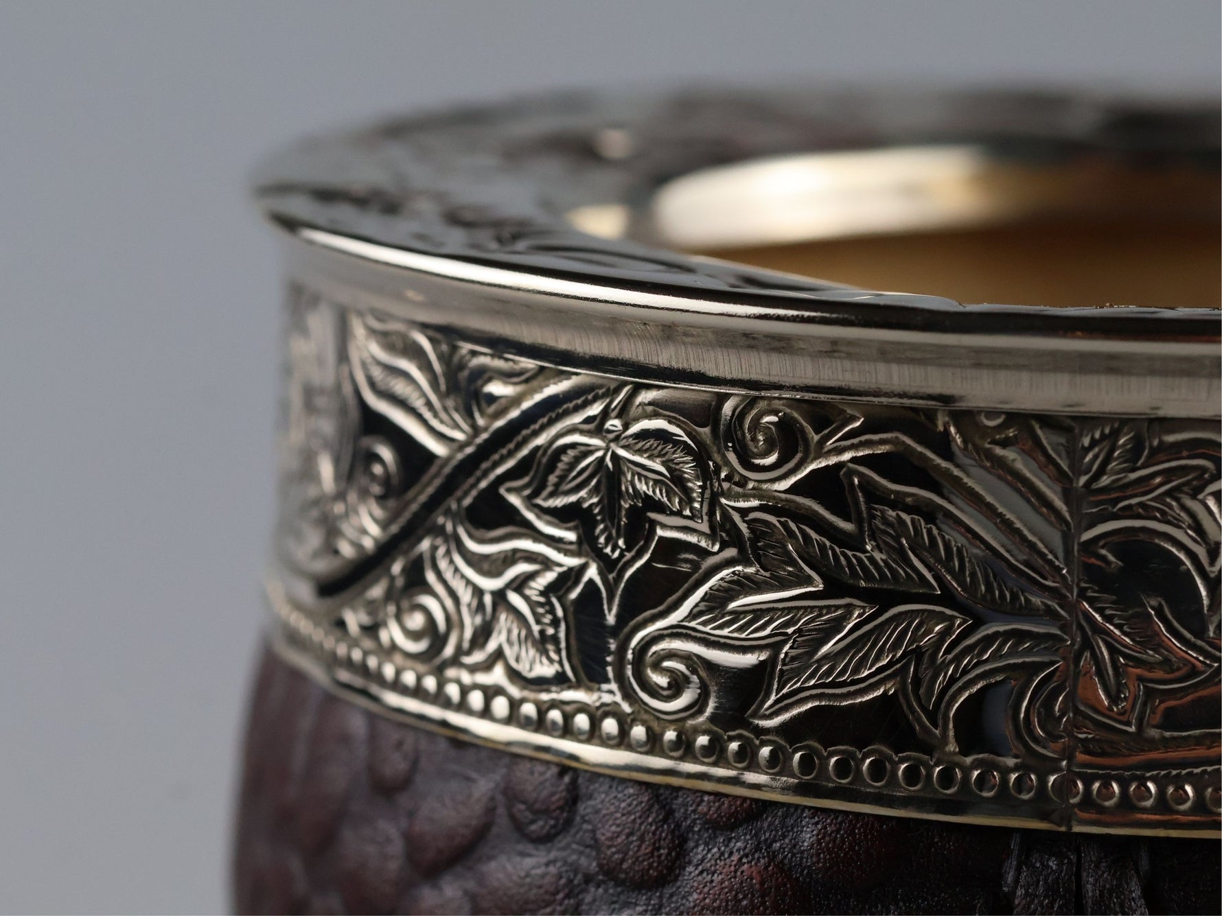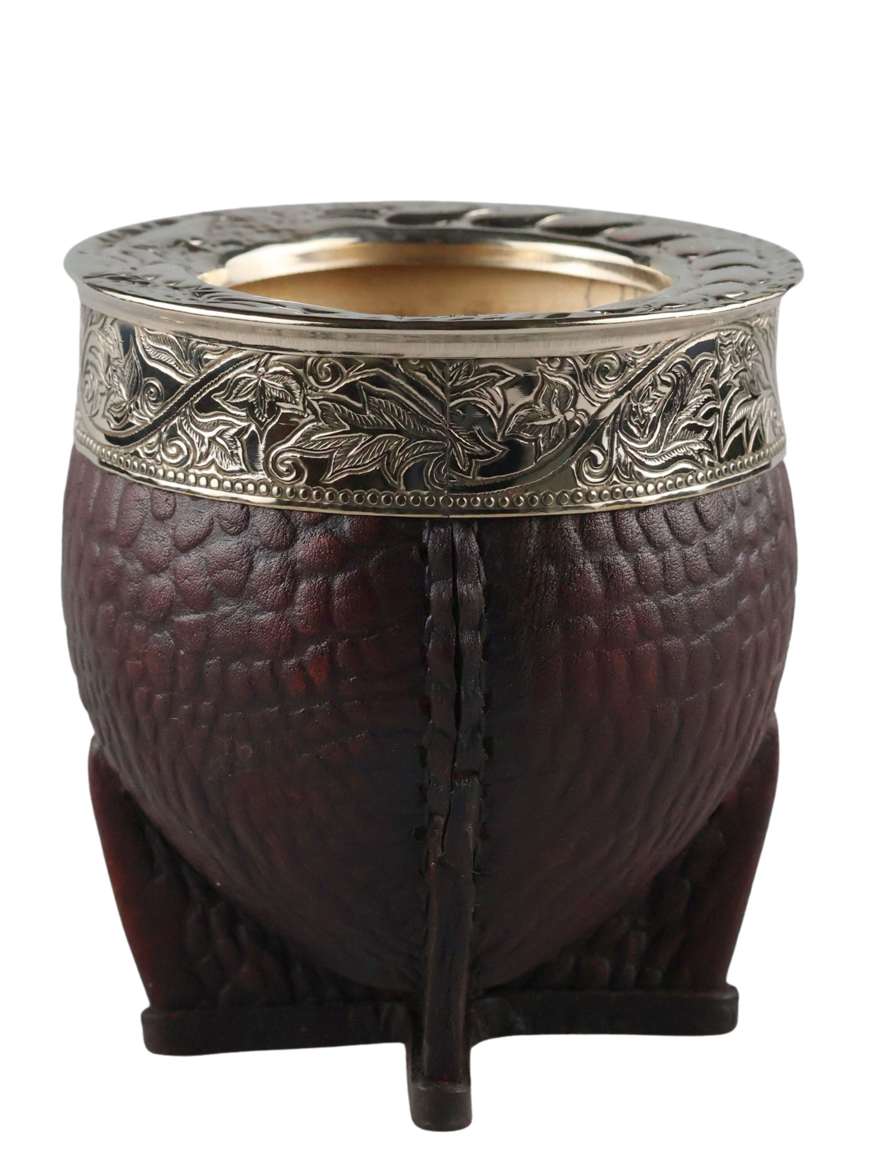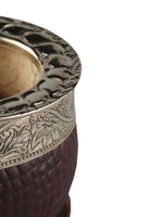 Een kalebas voor de kenner. De Martin Fierro Imperial Cincelada valt op door de combinatie van krokodillenleer in een warme, donkerbruine kleur en een breed geciseleerde alpaca ring met een gedetailleerd blad- en rankenmotief. De imperial vorm biedt een ruim volume en ligt comfortabel in de hand, terwijl de stevige leren voet voor stabiliteit zorgt.